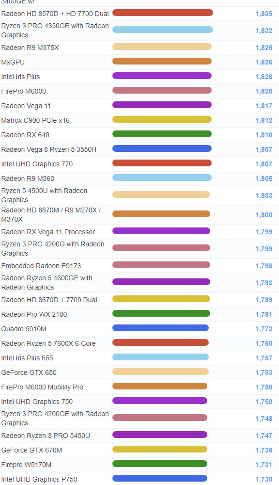 | 664 | Radeon RX Vega 11 Ryzen 5 3350G | 2,100 |