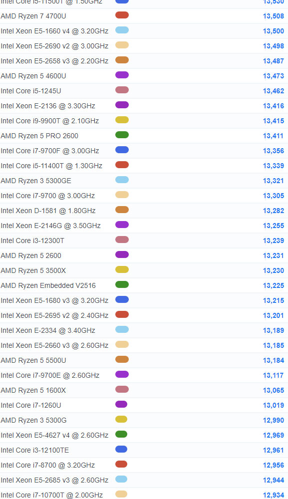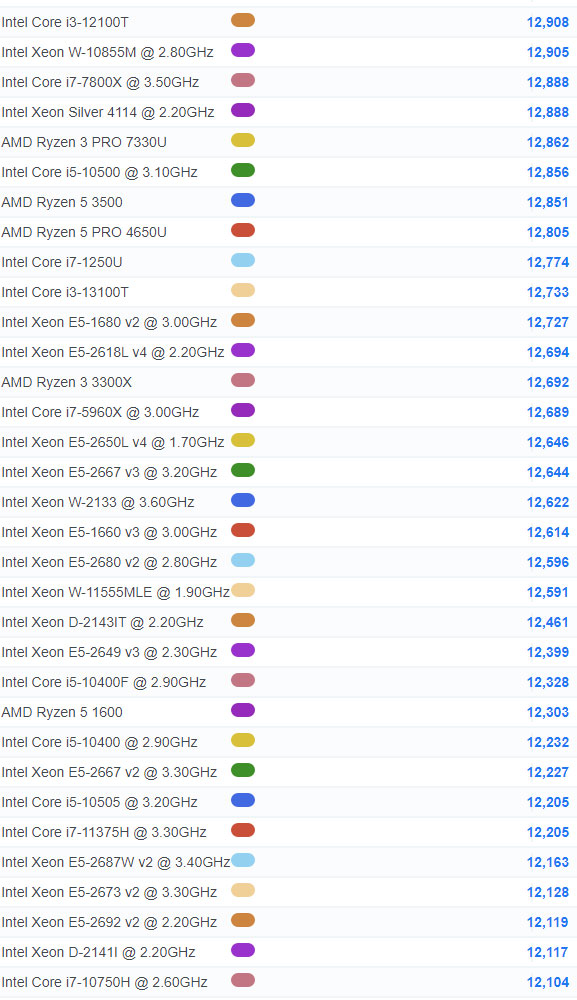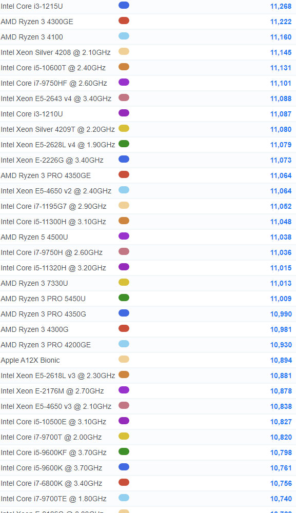 | 999 | Intel Core i3-10300T @ 3.00GHz | 8,205 |