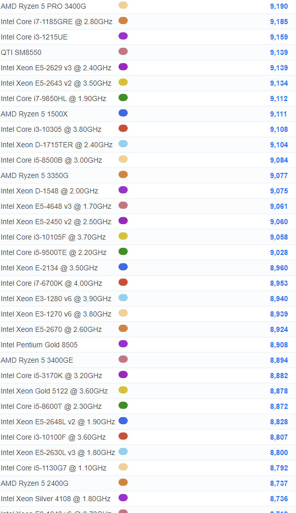 | 990 | Intel Core i5-9400T @ 1.80GHz | 8,276 |