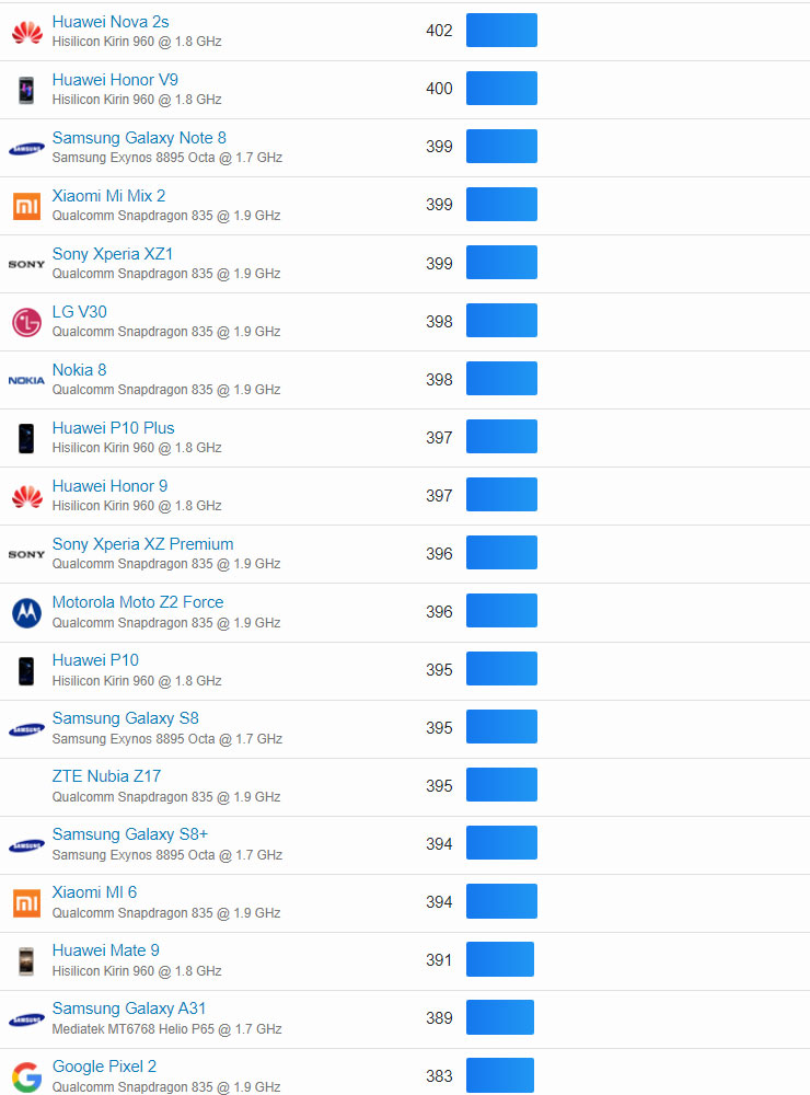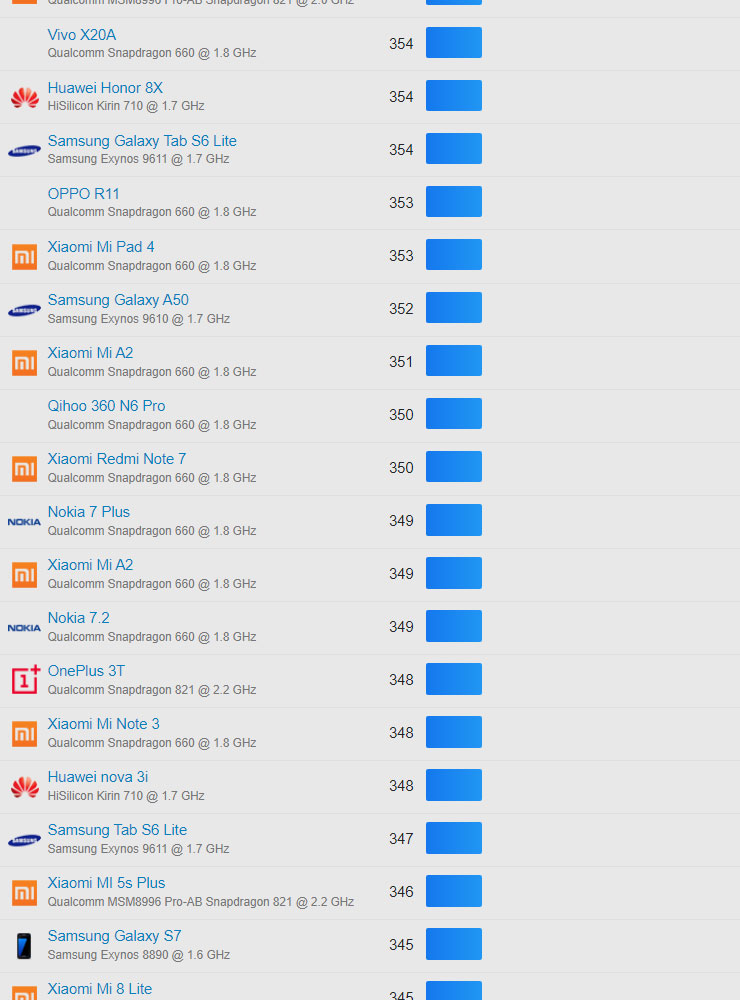 | 418 | Huawei Honor 7X | HiSilicon Kirin 659 @ 1.7 GHz | 210 |