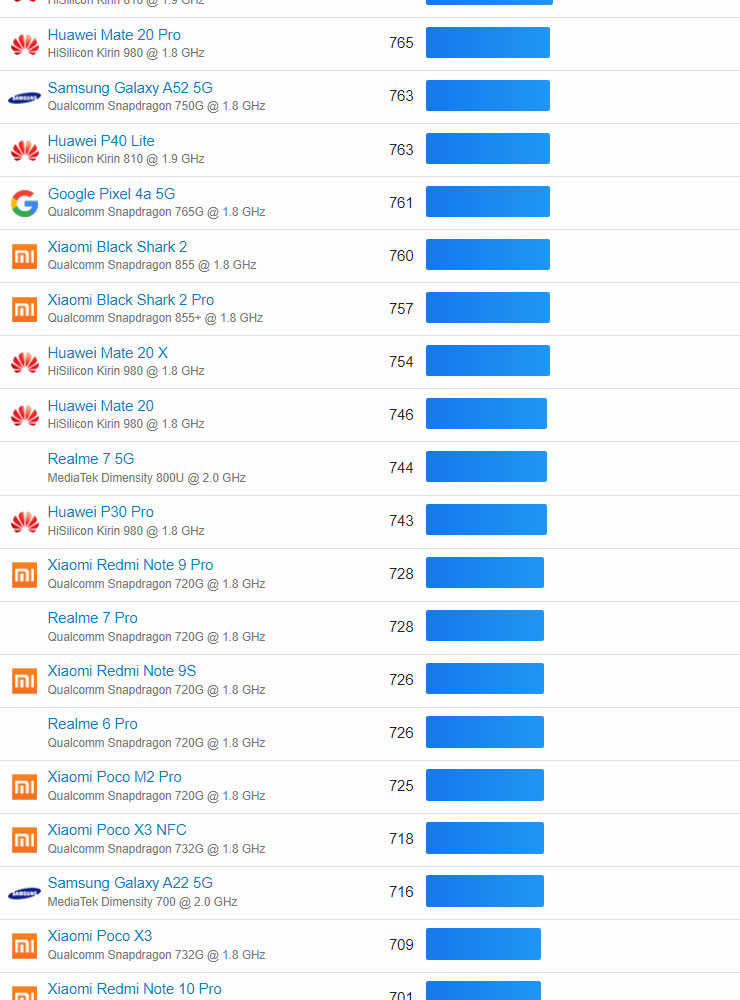 | 50 | Xiaomi Redmi K40 | Qualcomm Snapdragon 870 @ 1.8 GHz | 1184 |