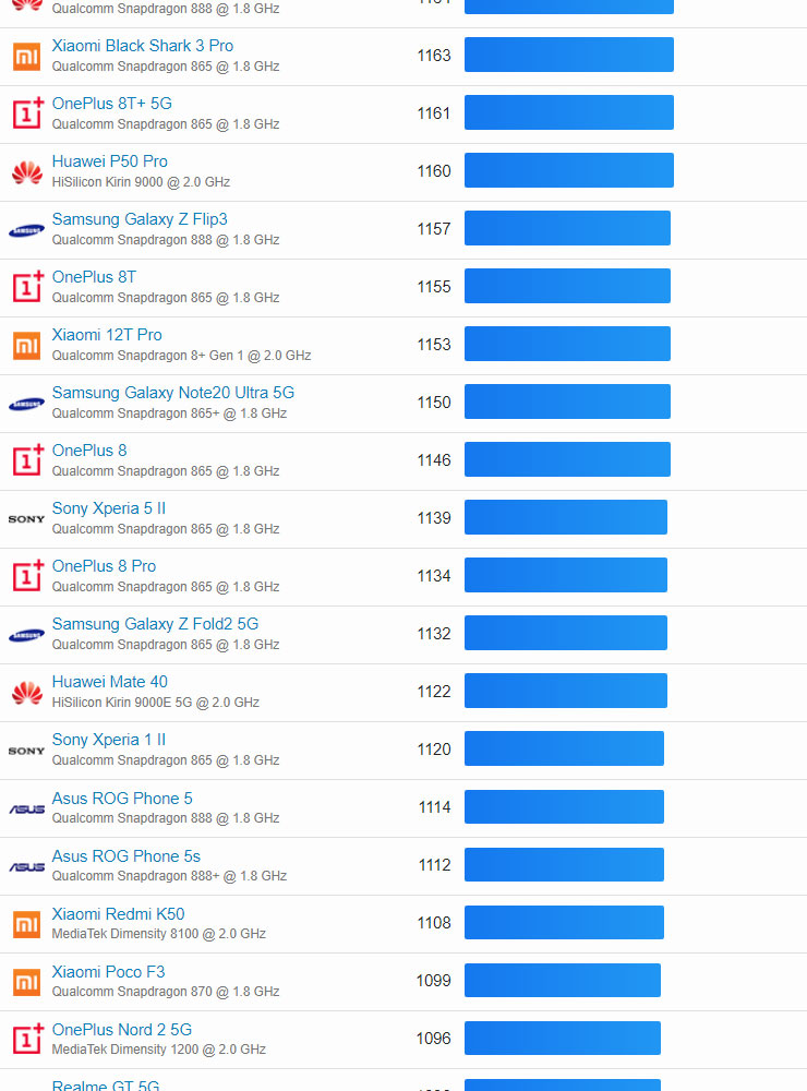 | 57 | OnePlus 8T+ 5G | Qualcomm Snapdragon 865 @ 1.8 GHz | 1161 |