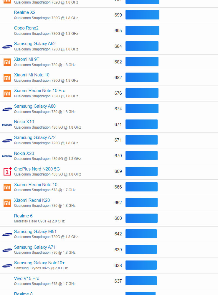 | 404 | OnePlus Nord N100 | Qualcomm Snapdragon 460 @ 1.8 GHz | 269 |