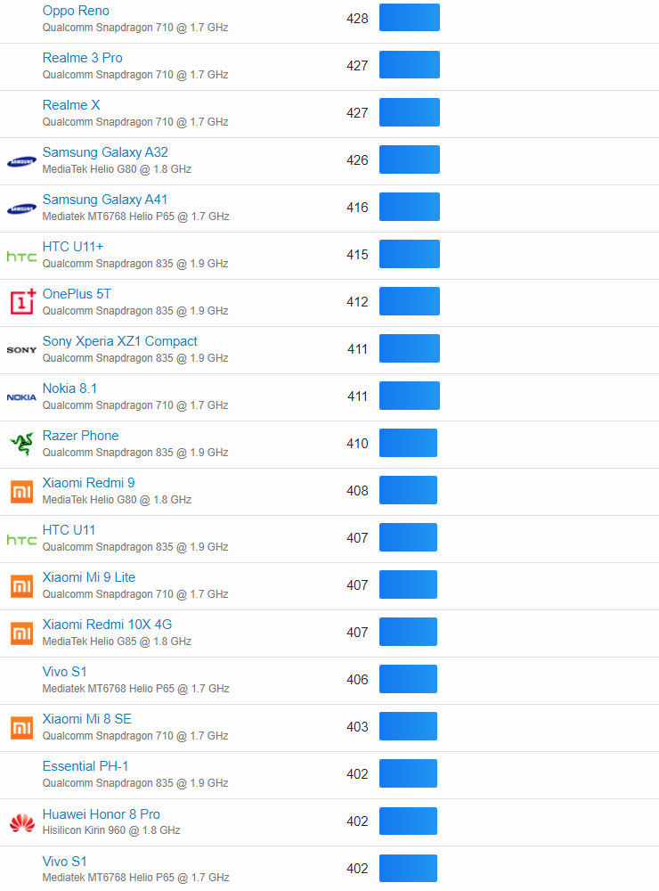 | 433 | Xiaomi Mi A1 | Qualcomm Snapdragon 625 @ 2.0 GHz | 191 |