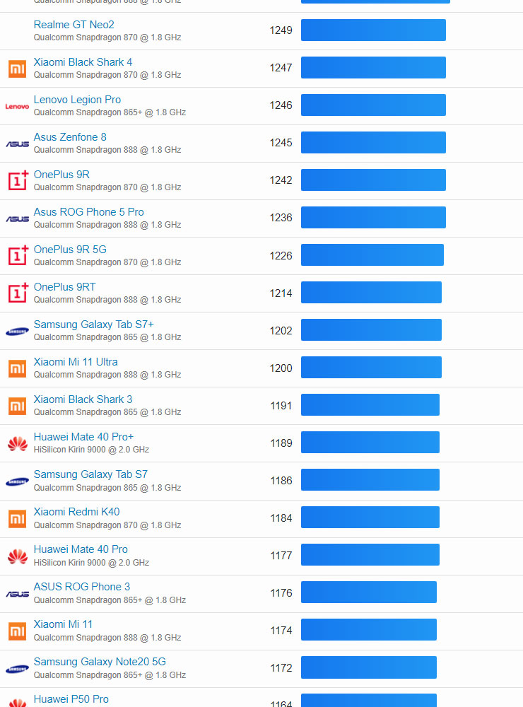 | 44 | OnePlus 9RT | Qualcomm Snapdragon 888 @ 1.8 GHz | 1214 |