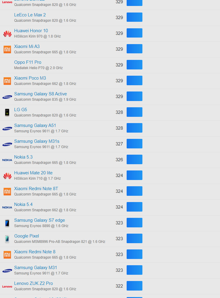 | 398 | Nokia 7.1 | Qualcomm Snapdragon 636 @ 1.6 GHz | 278 |