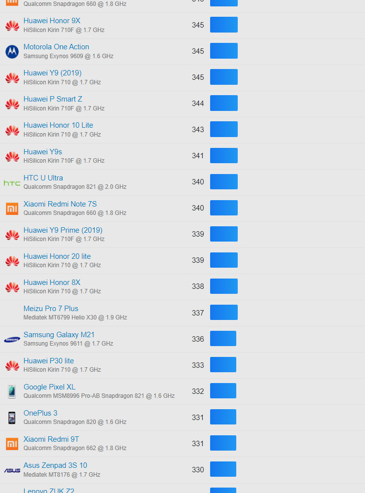 | 420 | Huawei Honor 9 Lite | HiSilicon Kirin 659 @ 1.7 GHz | 209 |