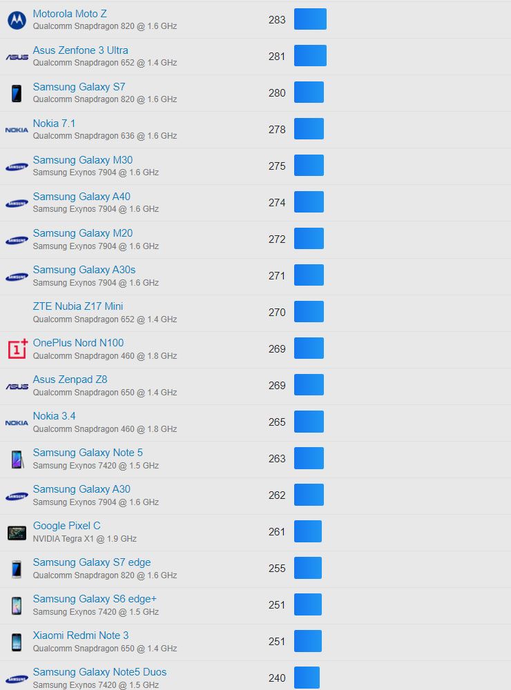 | 402 | Samsung Galaxy A30s | Samsung Exynos 7904 @ 1.6 GHz | 271 |
