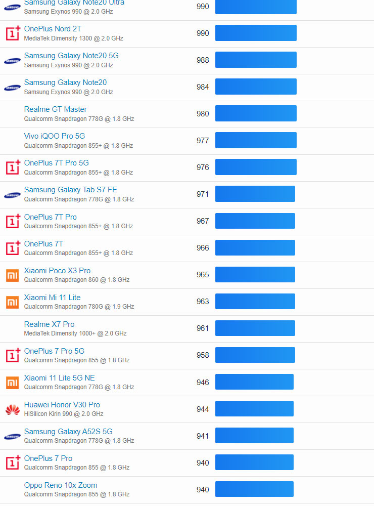 | 74 | Realme GT 5G | Qualcomm Snapdragon 888 @ 1.8 GHz | 1096 |