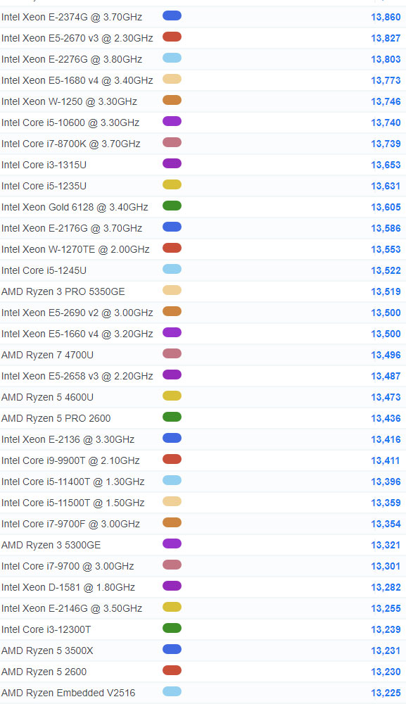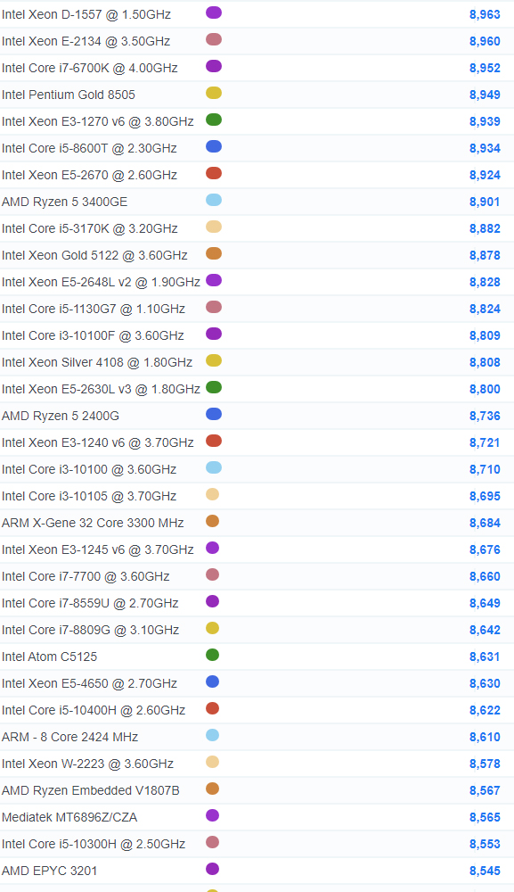 | 1010 | Intel Core i3-10100E @ 3.20GHz | 8,229 |