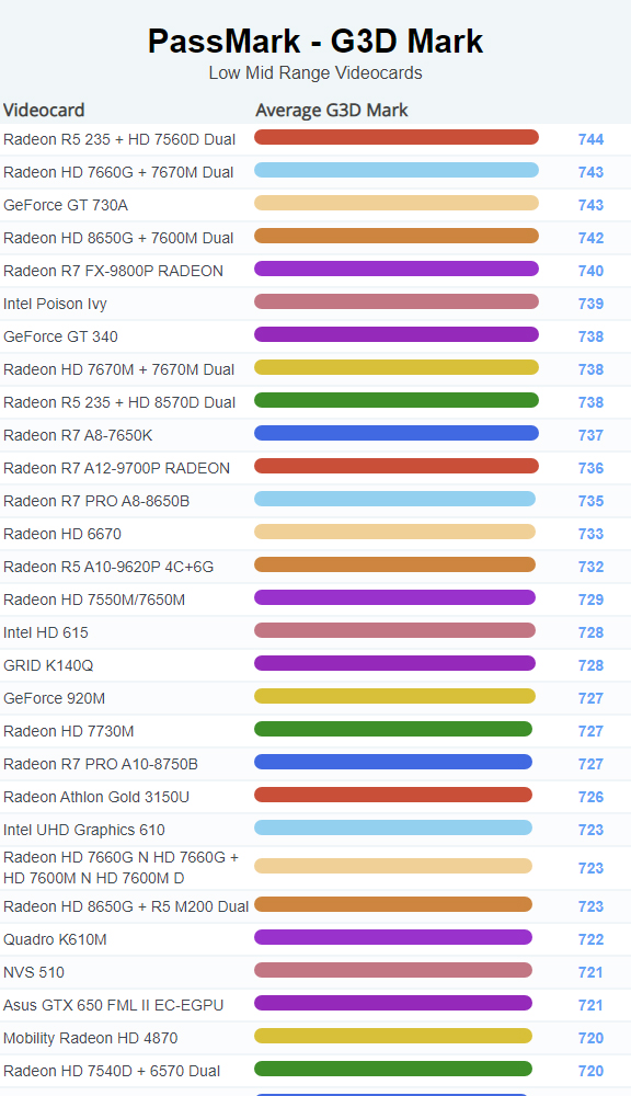 | 1253 | GeForce GT 730A | 743 |