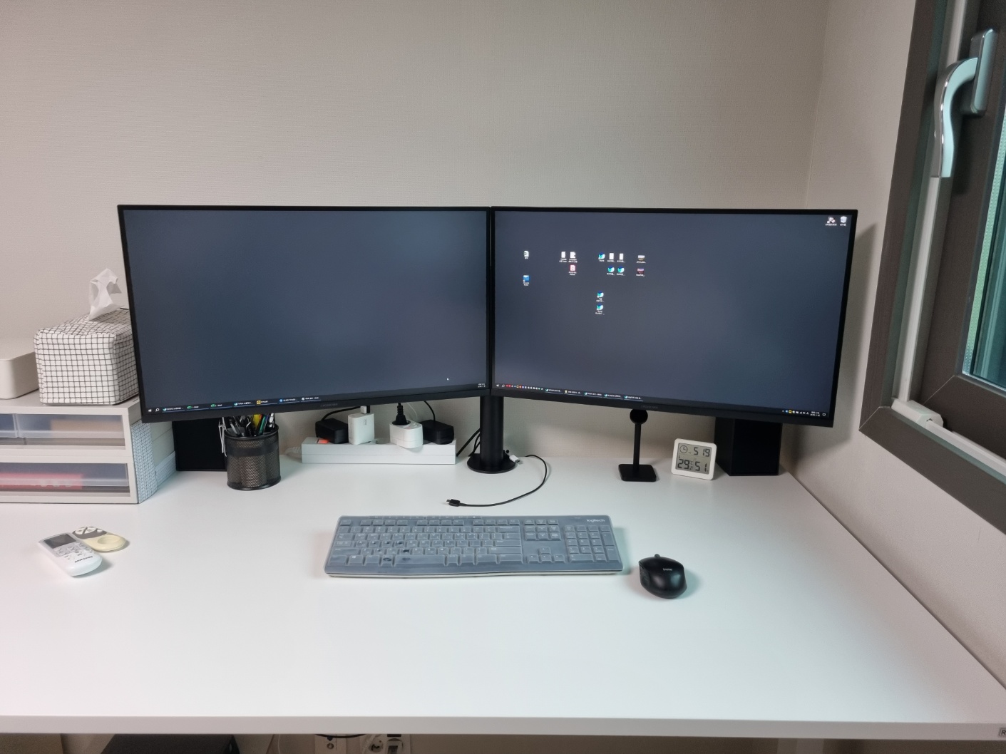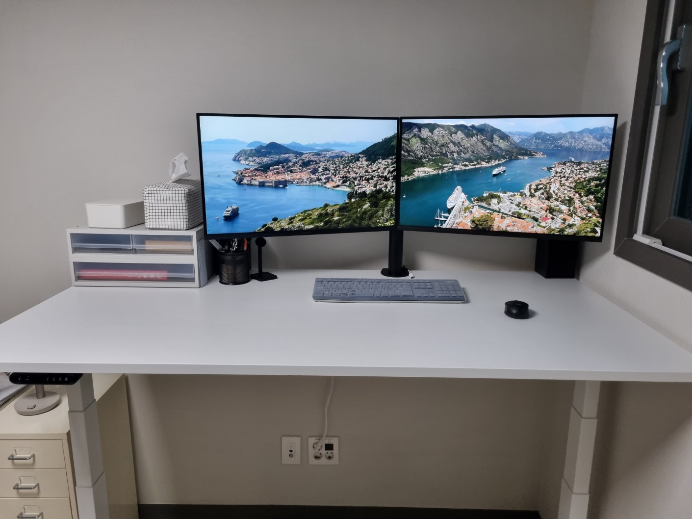 두개의 모니터 규격이 같고 모니터 암을 이용해 거치해 두어서