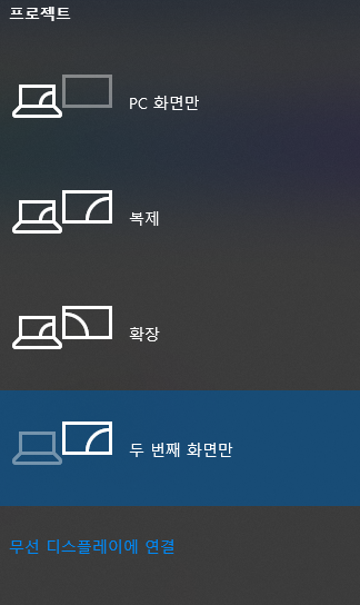 프로젝트 메뉴는 win+p 버튼을 누르면 우측에서 나옵니다~
