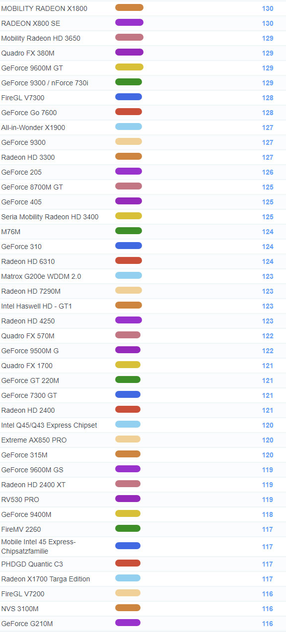 | 1605 | Radeon HD 2400 XT | 119 |