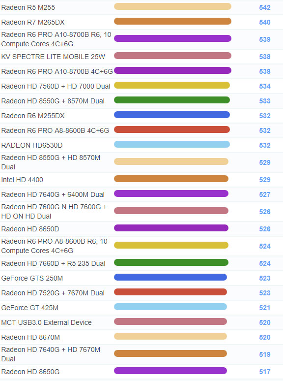 | 1105 | Radeon R6 + R7 M265DX Dual | 571 |