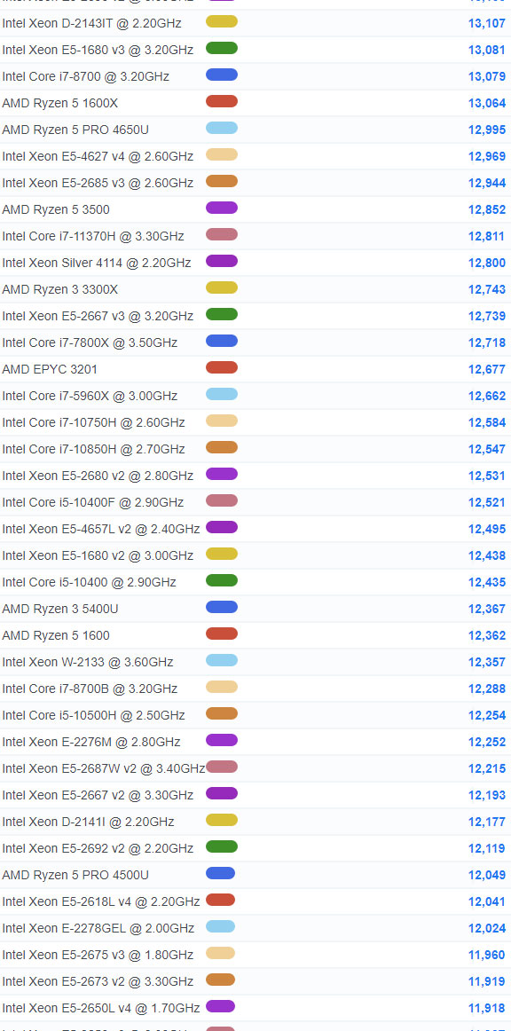 | 74 | Intel Core i9-10920X @ 3.50GHz | 26,480 |