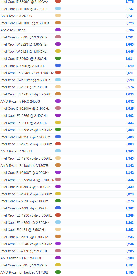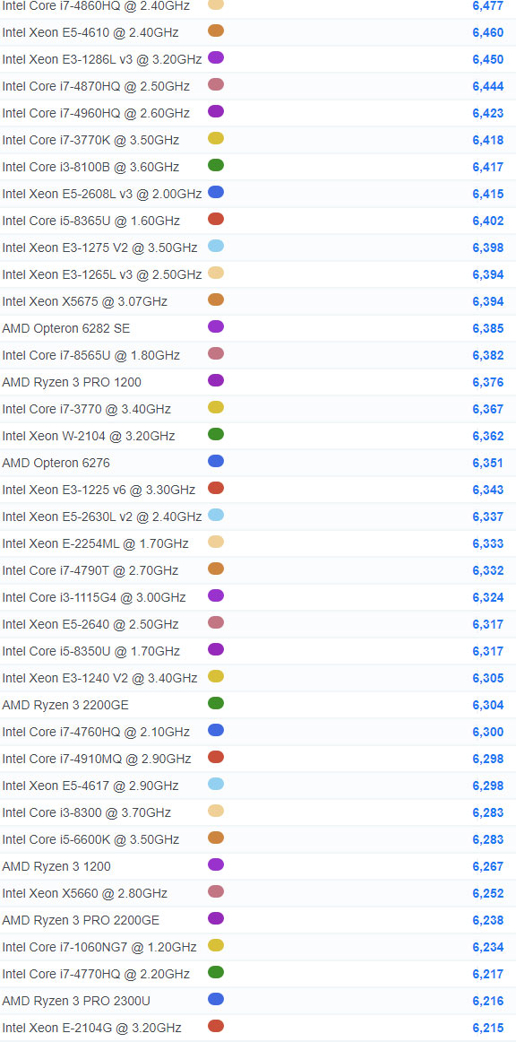 | 773 | Intel Core i3-8100B @ 3.60GHz | 6,417 |