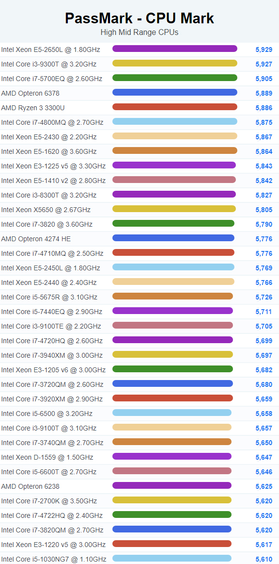 | 867 | Intel Core i3-9100T @ 3.10GHz | 5,657 |