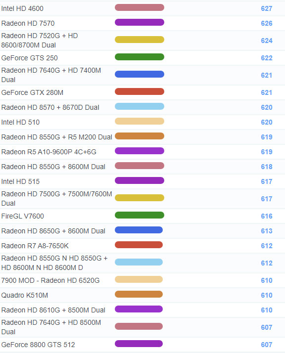 | 623 | Radeon R7 PRO A8-8670E | 1,310 |