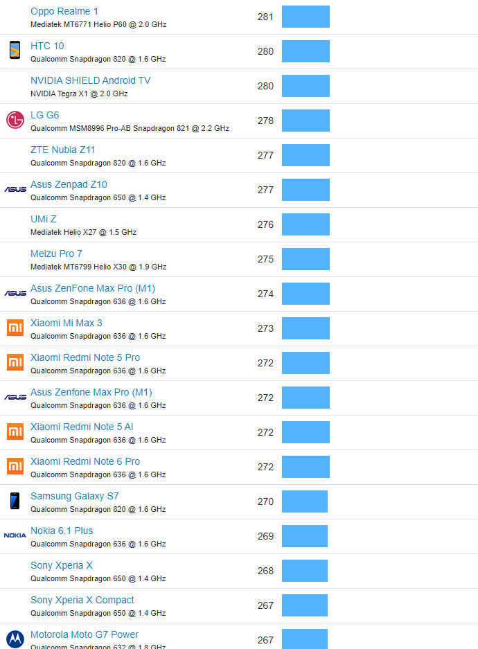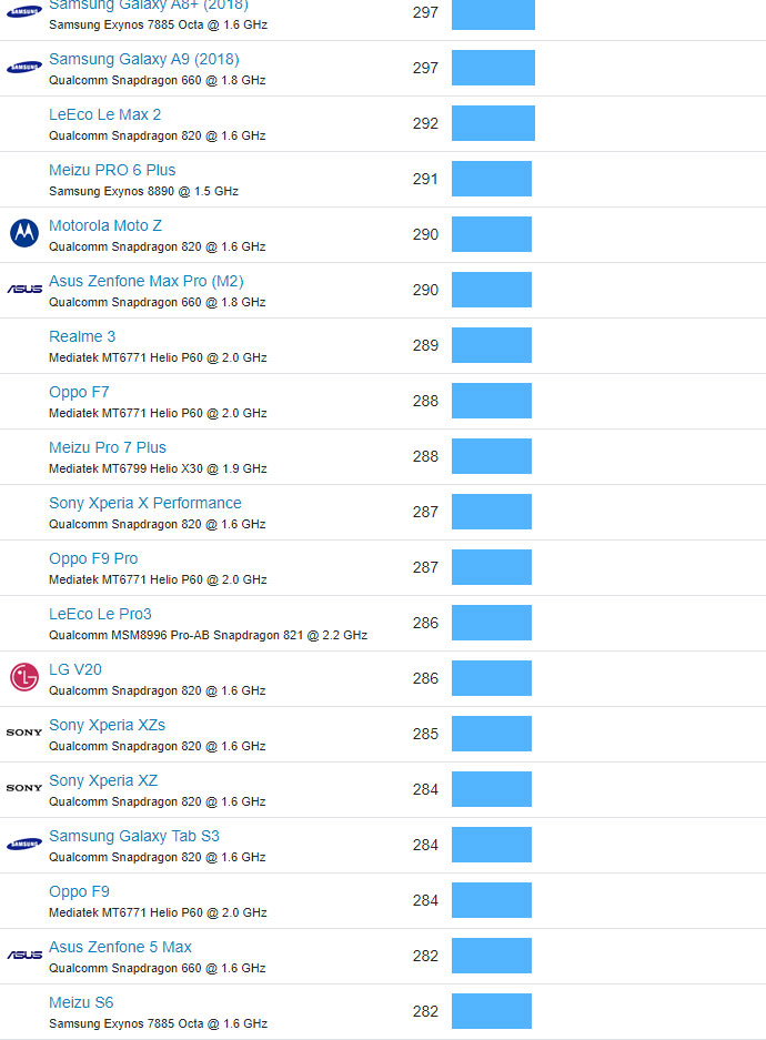 | 519 | Motorola Moto G6 Play | Qualcomm Snapdragon 430 @ 1.4 GHz | 105 |