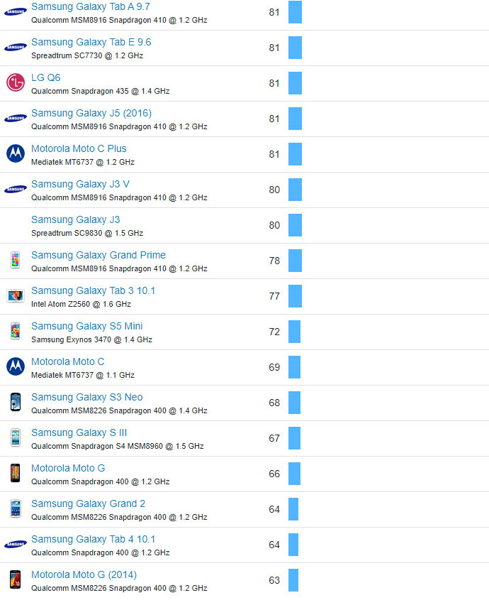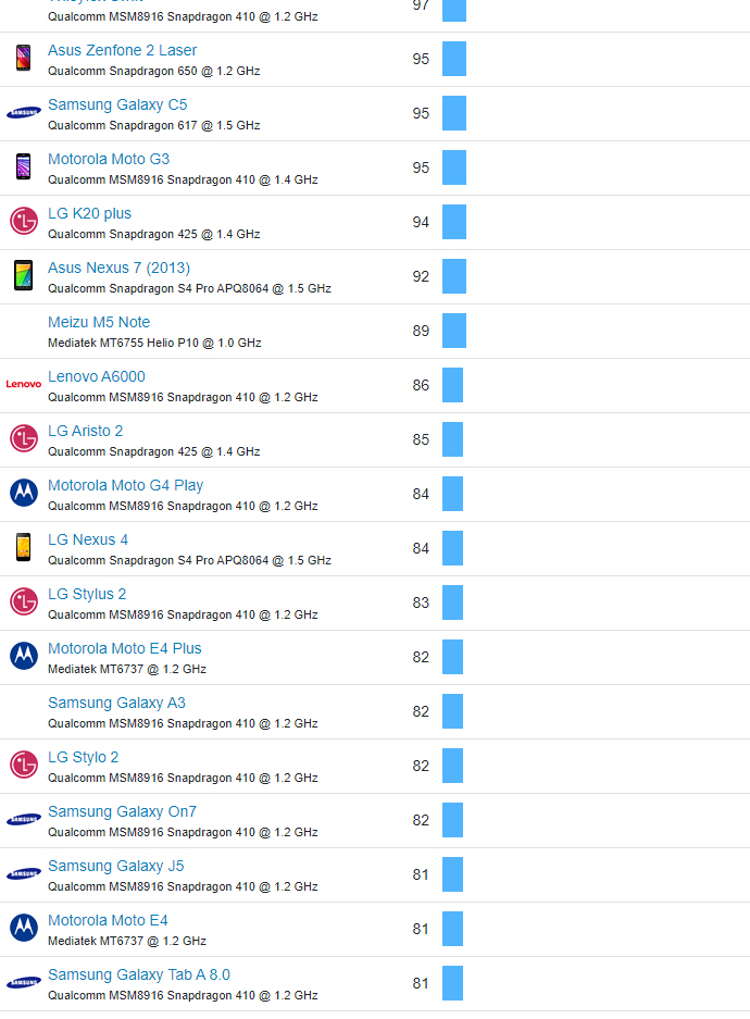 | 551 | Motorola Moto G4 Play | Qualcomm MSM8916 Snapdragon 410 @ 1.2 GHz | 84 |