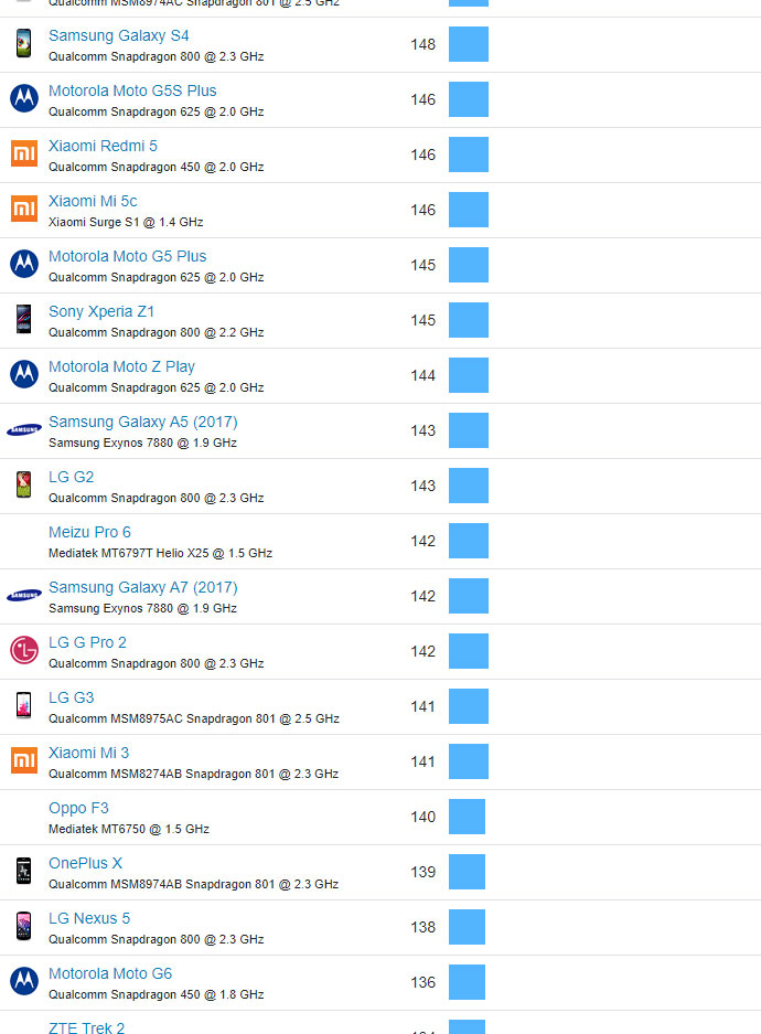 | 525 | Motorola Moto G5 | Qualcomm Snapdragon 430 @ 1.4 GHz | 104 |