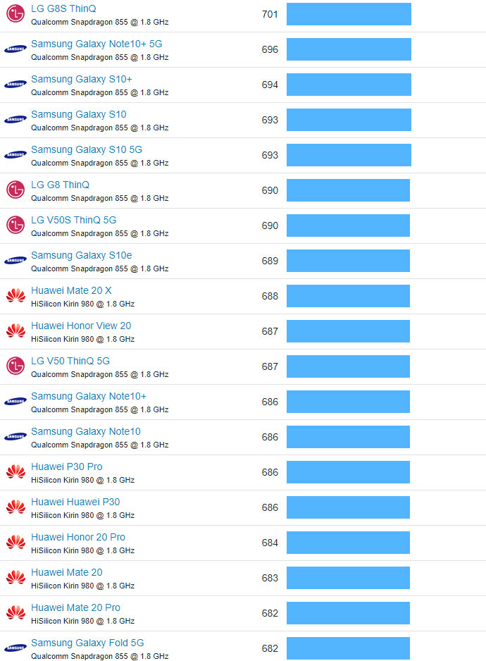 | 55 | LG G8S ThinQ | Qualcomm Snapdragon 855 @ 1.8 GHz | 701 |