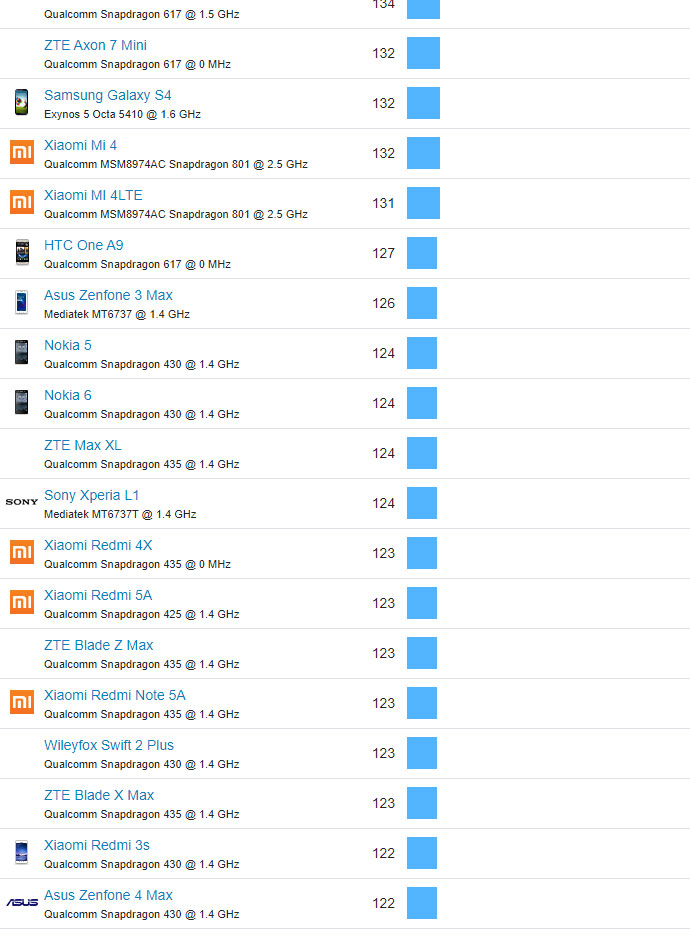 | 488 | Xiaomi Redmi 4A | Qualcomm Snapdragon 425 @ 1.4 GHz | 120 |