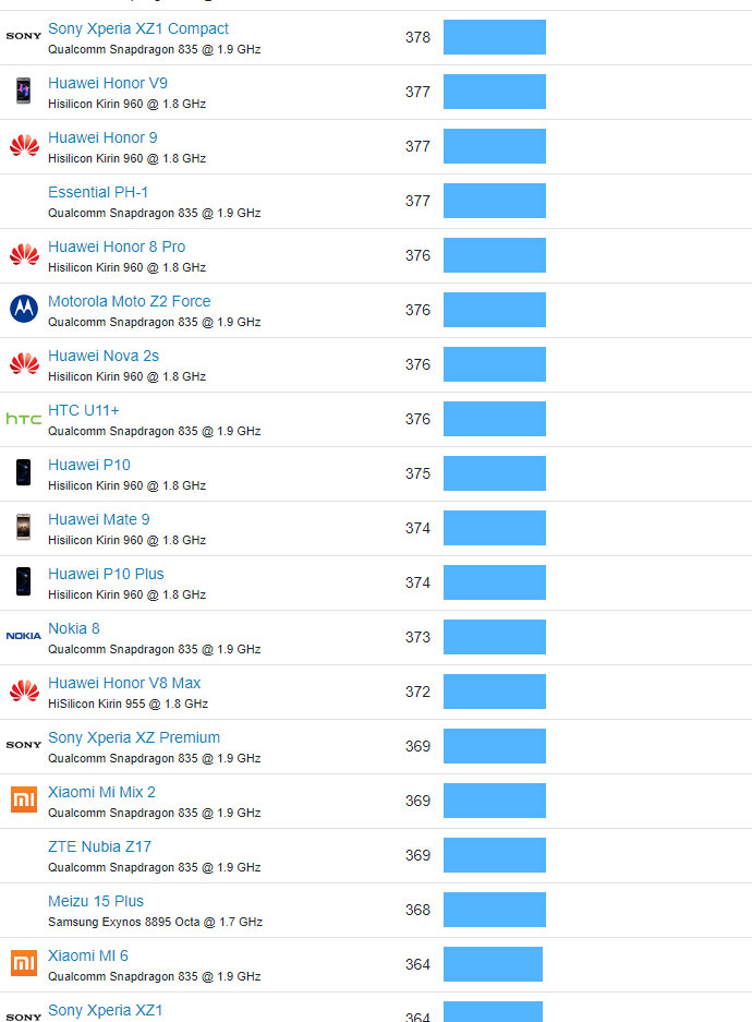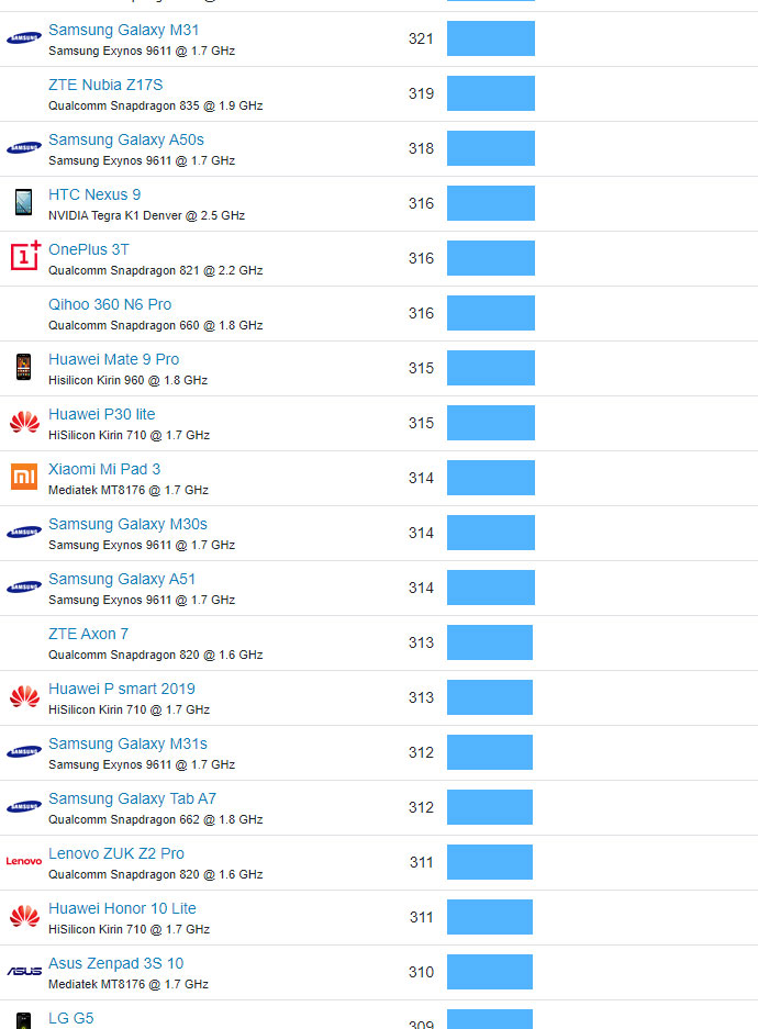 | 521 | Huawei P9 lite mini | Qualcomm Snapdragon 425 @ 1.4 GHz | 105 |