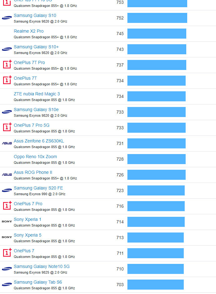 | 41 | OnePlus 7T | Qualcomm Snapdragon 855+ @ 1.8 GHz | 734 |