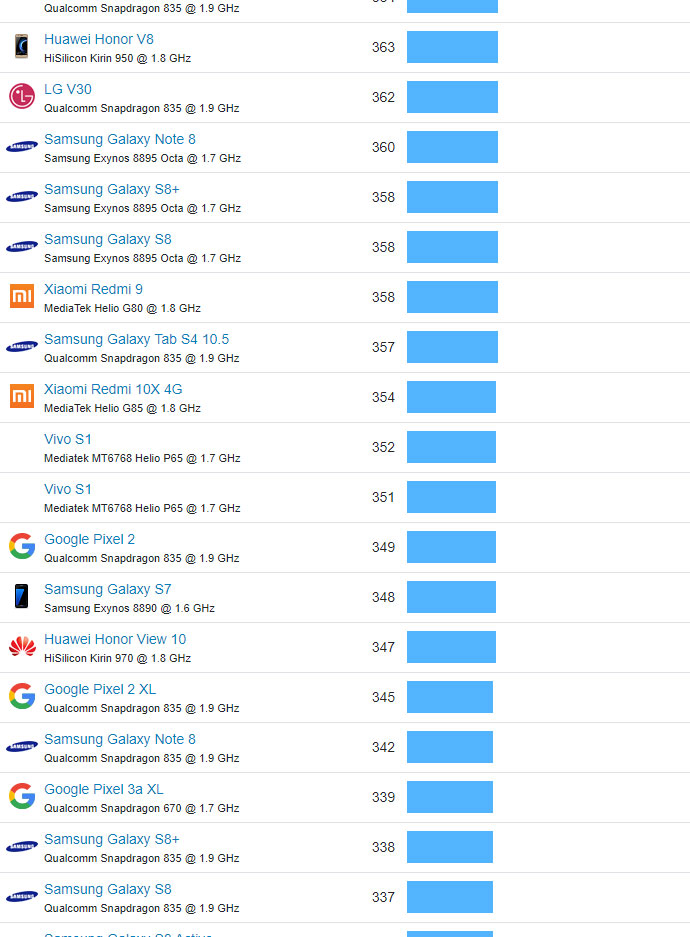 | 499 | Samsung Galaxy J7 | Qualcomm Snapdragon 617 @ 1.6 GHz | 116 |