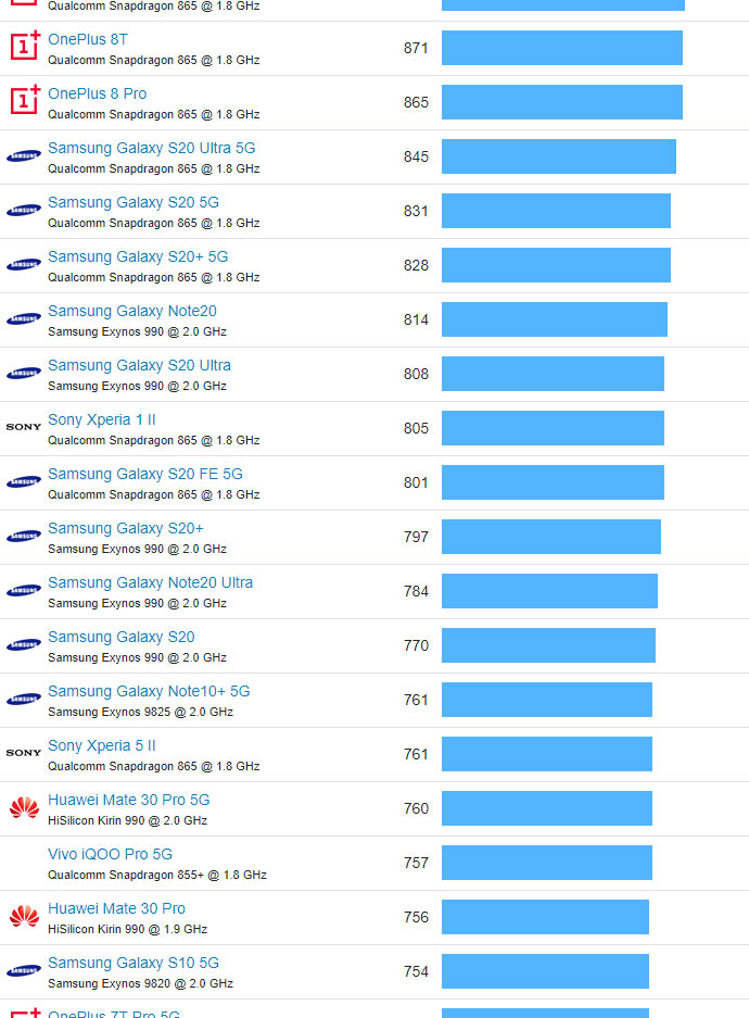 | 18 | OnePlus 8T | Qualcomm Snapdragon 865 @ 1.8 GHz | 871 |