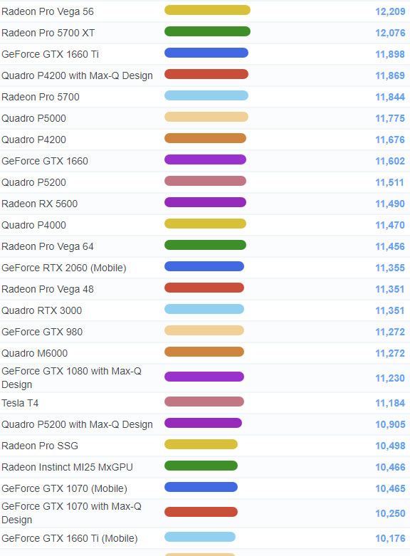 | 74 | Radeon Pro 5700 XT | 12,076 |