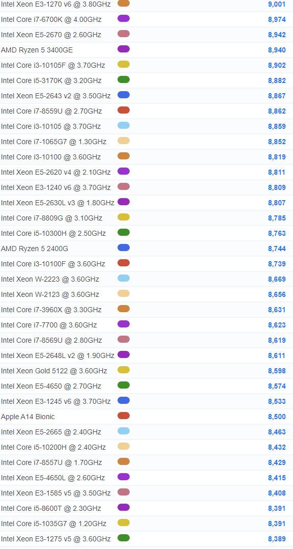 | 804 | Intel Core i7-8665U @ 1.90GHz | 6,534 |