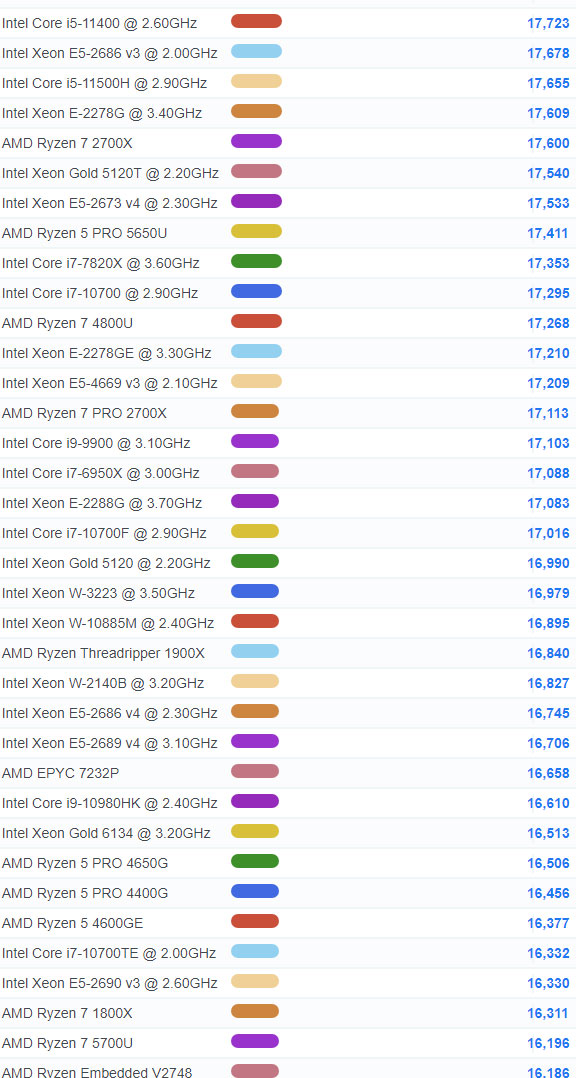 | 78 | Intel Xeon W-2195 @ 2.30GHz | 27,325 |