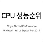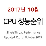 CPU 성능순위/성능비교, 2017년 10월 Single Thread Performance Updated 12th of October 2017 PassMark - CPU Mark 패스마크사이트의 CPU 벤치마크(싱글스레드 기준), 총 1,000개 CPU 모델에 대한 성능벤치입니다. 'Ctrl + F'로 모델을 바로 검색하세요. 모바일에서는 '페이지 내에서 찾기 기능'을 사용하여 검색하면 됩니다. Rank Model Mark 1 Intel Core i7-8700K @ 3.70GHz 2,764 2 Intel Core i7-7740X @ 4.30GHz 2,600 3 Intel Core i7-7700K @ 4.20GHz 2,581 4 Intel Core i5-8600K @ 3.60GHz 2,570 5 Intel..